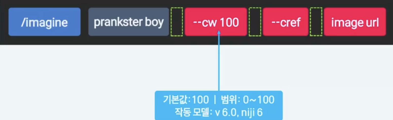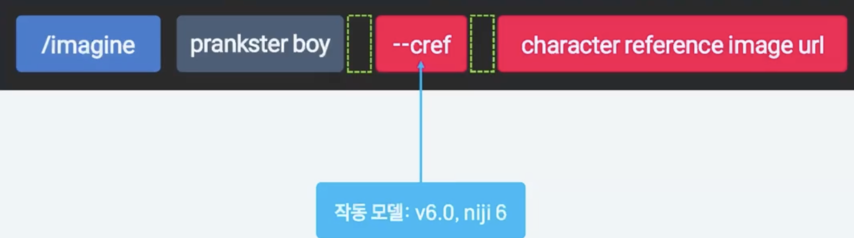 --cref: Character Reference 파라미터. 특정 인물의 외형을 일관되게 유지하면서 다양한 포즈, 배경, 상황을 그릴때 사용