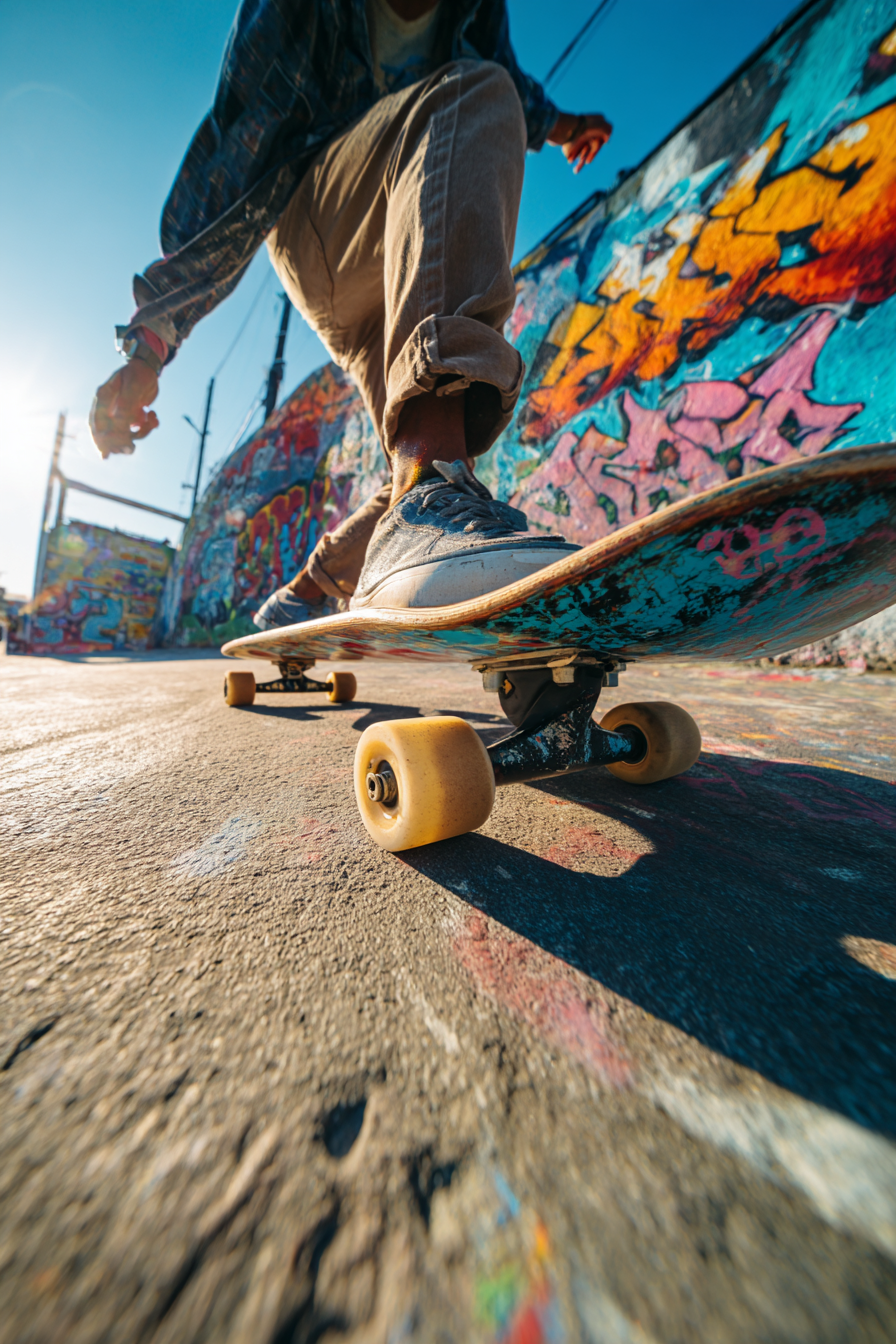 sportive street action shot, dynamic tilted diagonal composition, lower body of a skater captured mid-motion, skateboard angled forward as if accelerating, wheels showing clear motion blur, skater leaning into the movement, colorful graffiti both on the concrete ground and on a nearby wall, strong sunlight with dramatic shadows, vivid street colors, energetic urban atmosphere, cinematic still moment, high contrast, fast-paced mood, no face visible, modern street sports aesthetic --ar 2:3 --v 7.0