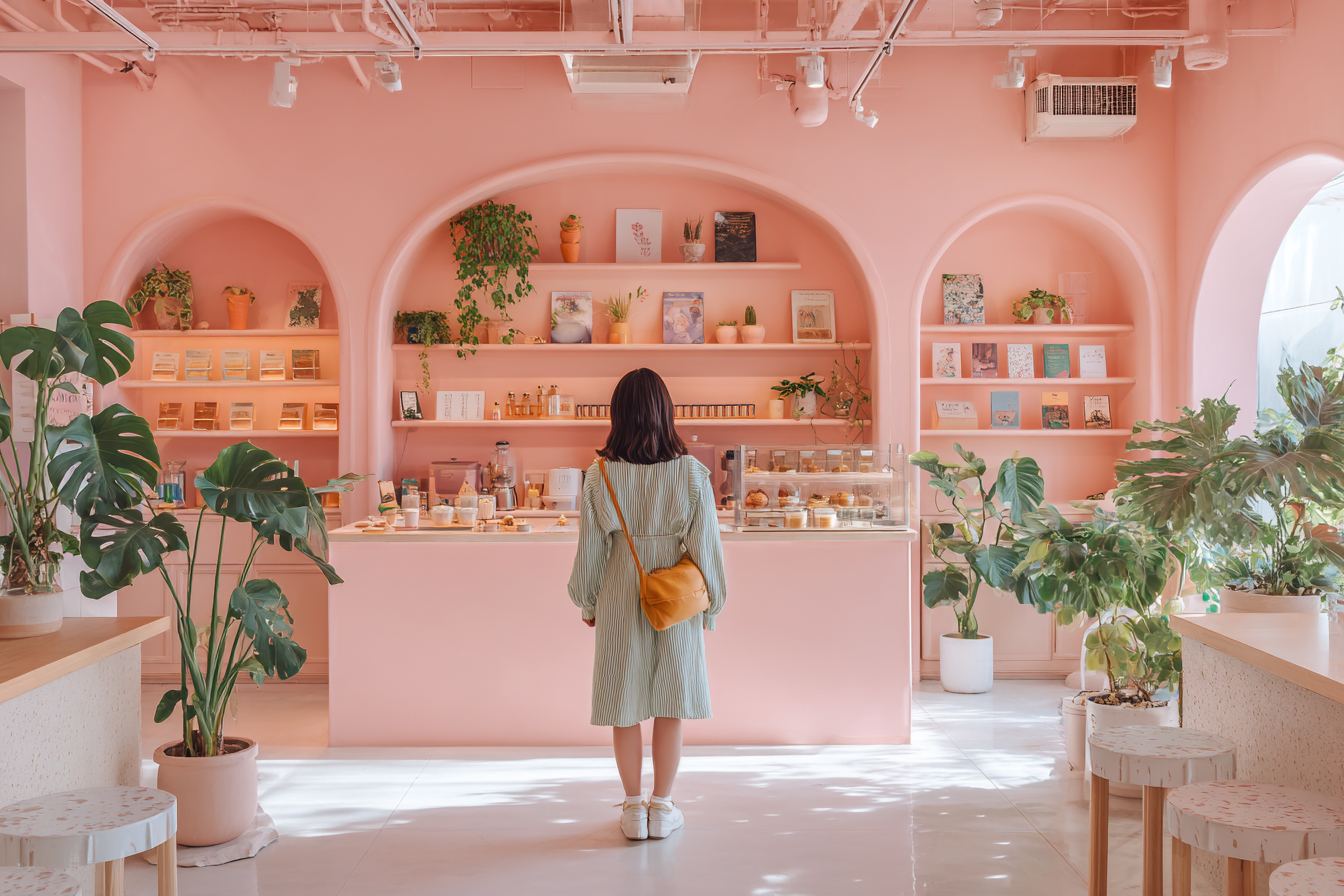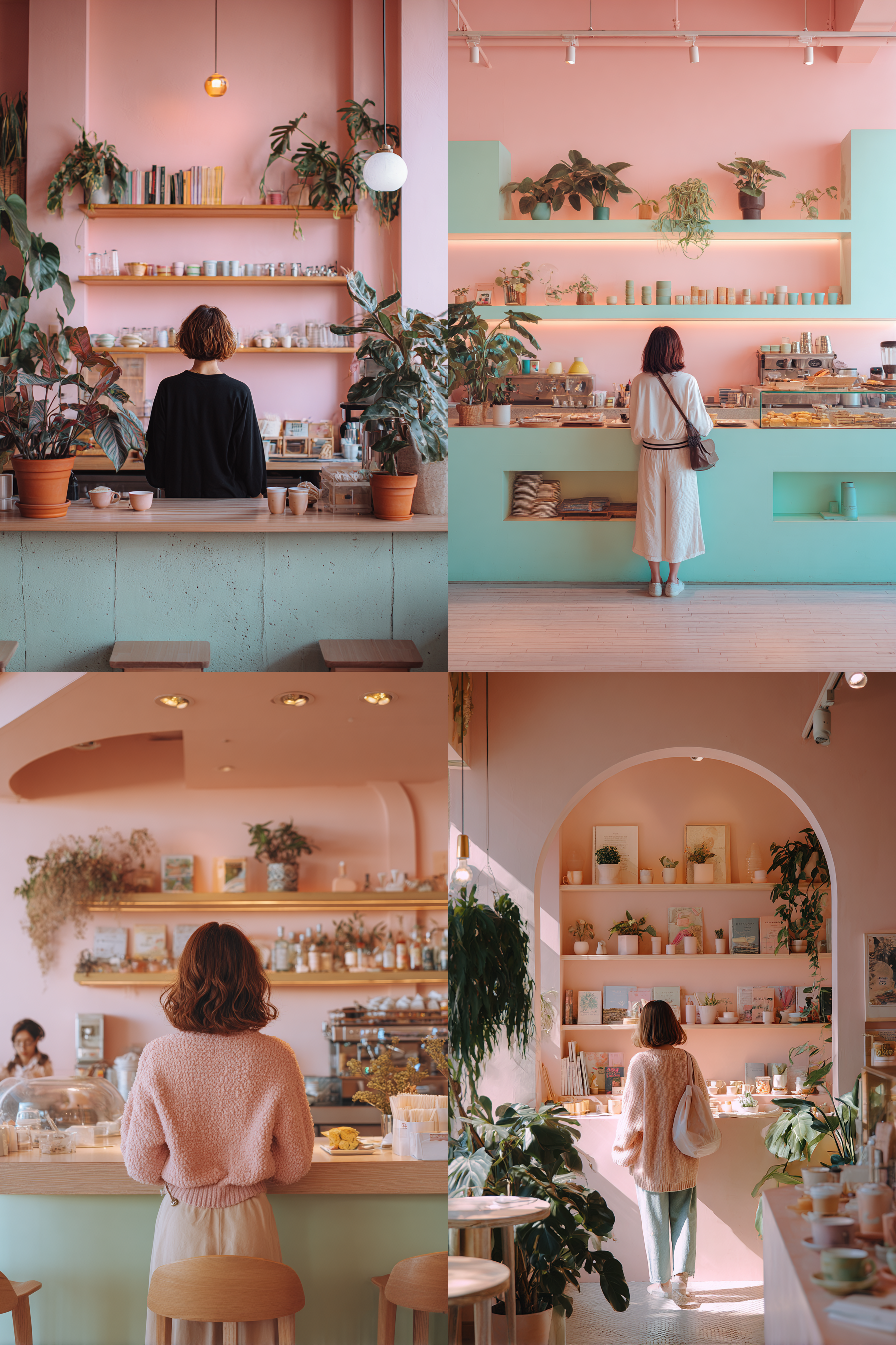 pastel lifestyle interior, symmetrical pastel wall and decor, soft pink and mint palette, warm natural lighting, a person seen from behind standing in the center, daily-life objects like coffee cups, plants, books on shelves, cozy modern cafe-like mood, realistic texture, minimal but warm atmosphere, instagrammable pastel aesthetic, clean and balanced --ar 3:2 --v 7.0