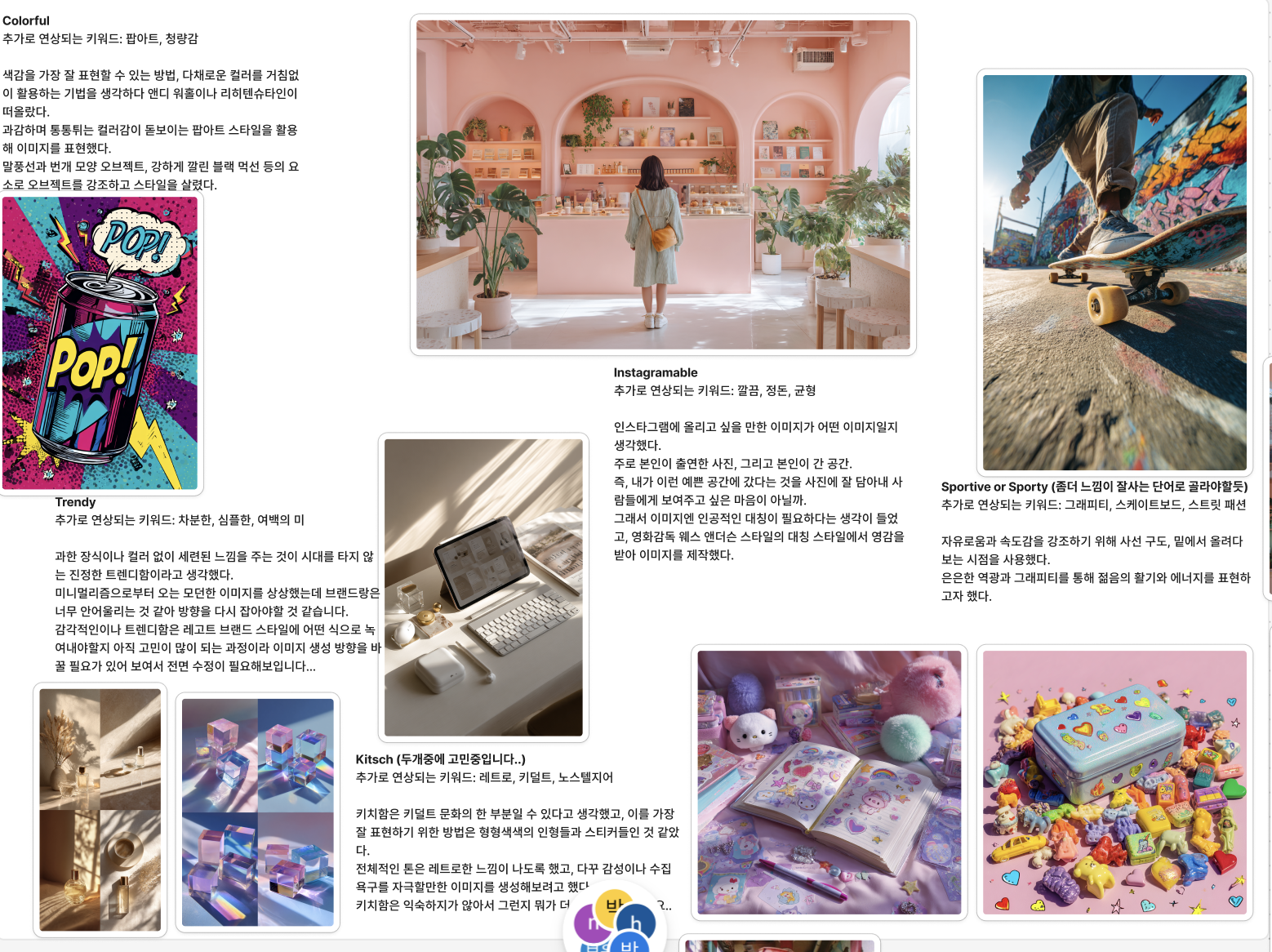 나는 같은 키워드별로 팀원들의 무드보드를 모아서 하나씩 일곱개를 만드는건 줄 알았는데, 알고보니 큰 하나의 무드보드를 만드는게 과제였던 것이다...
