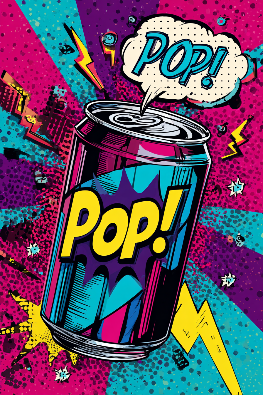 vibrant Roy Lichtenstein inspired pop art still life, central soda can with thick black cartoon outlines, CMYK color palette, glossy highlight, bold comic-style halftone shadows, explosive speech bubble saying "POP!" in upper corner, star and lightning bolt symbols scattered around, geometric color block background in magenta, cyan, yellow, dynamic graphic energy, clean 2.5D flat style, no realism, high contrast, playful retro comic mood --ar 2:3 --v 7.0