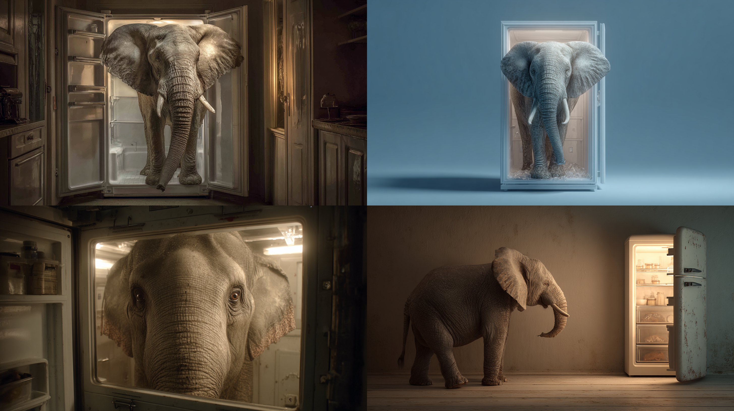 며칠 전에 갑자기 코끼리를 냉장고에 넣는 방법이라는 문구가 나한테 떠, 이미지로 만들고 싶어서 몇개 만들었다.