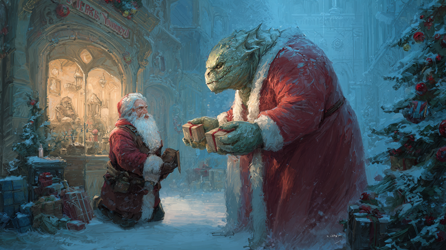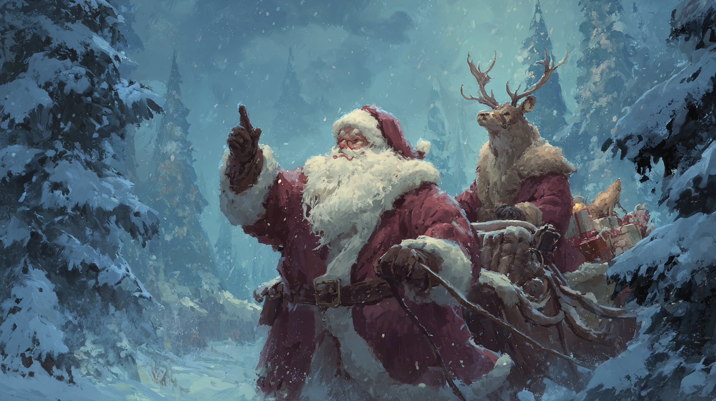 루돌프가 탄 설매를 끄는 산타 할부지.
