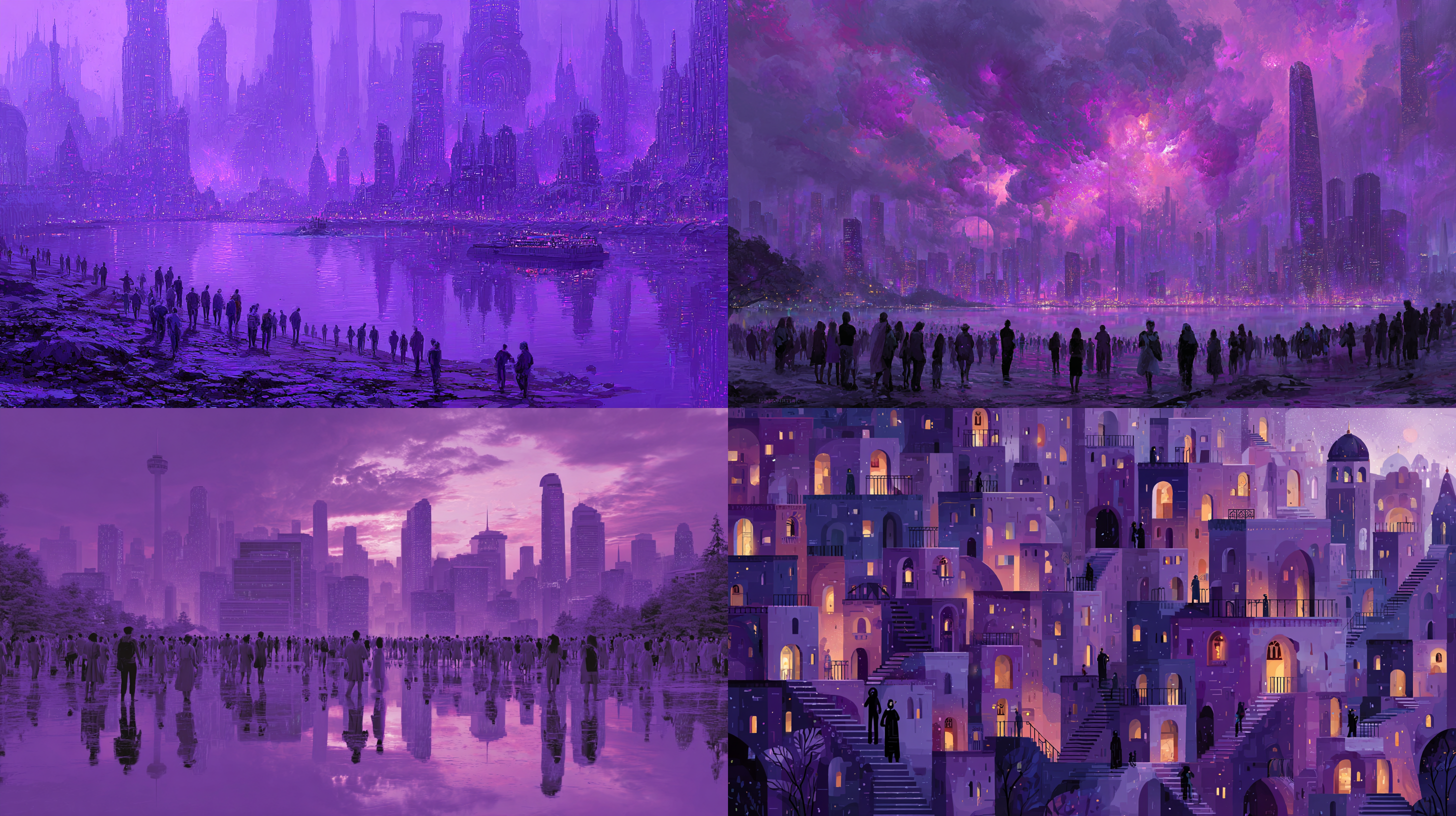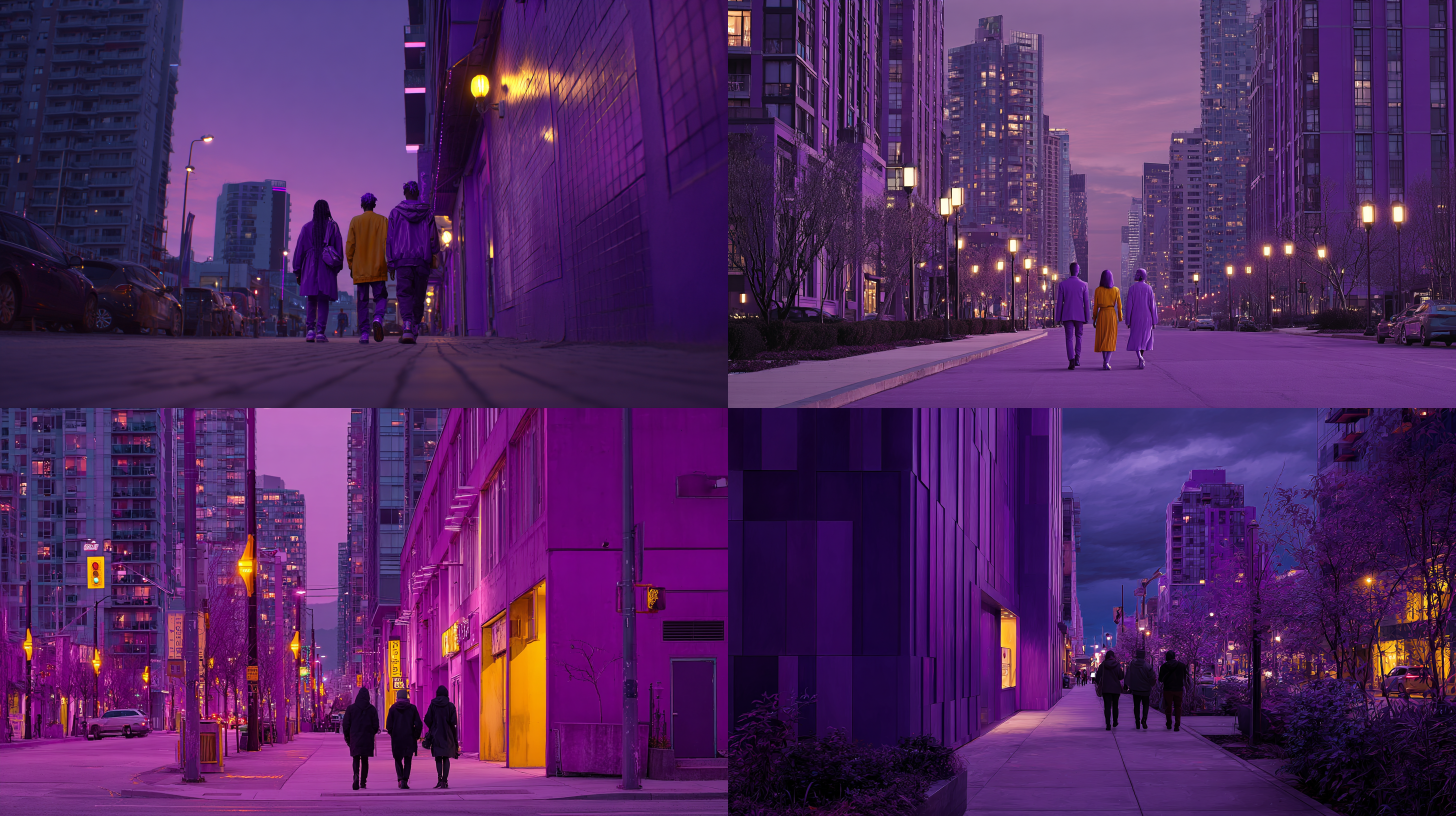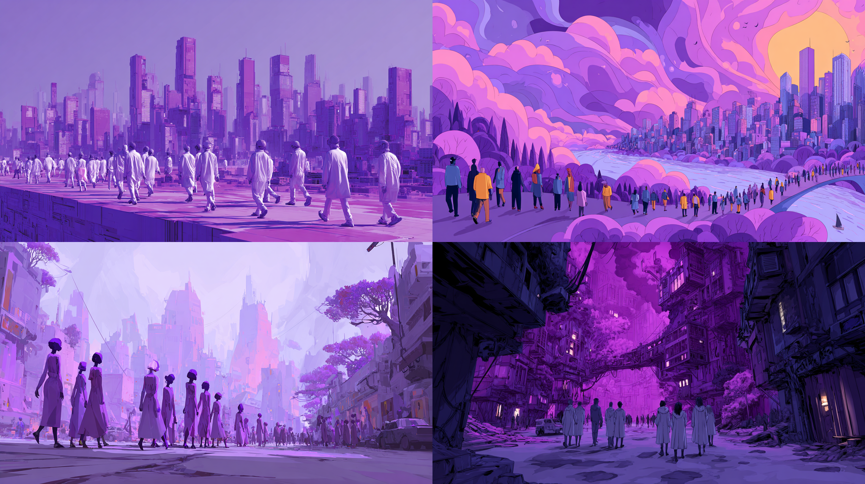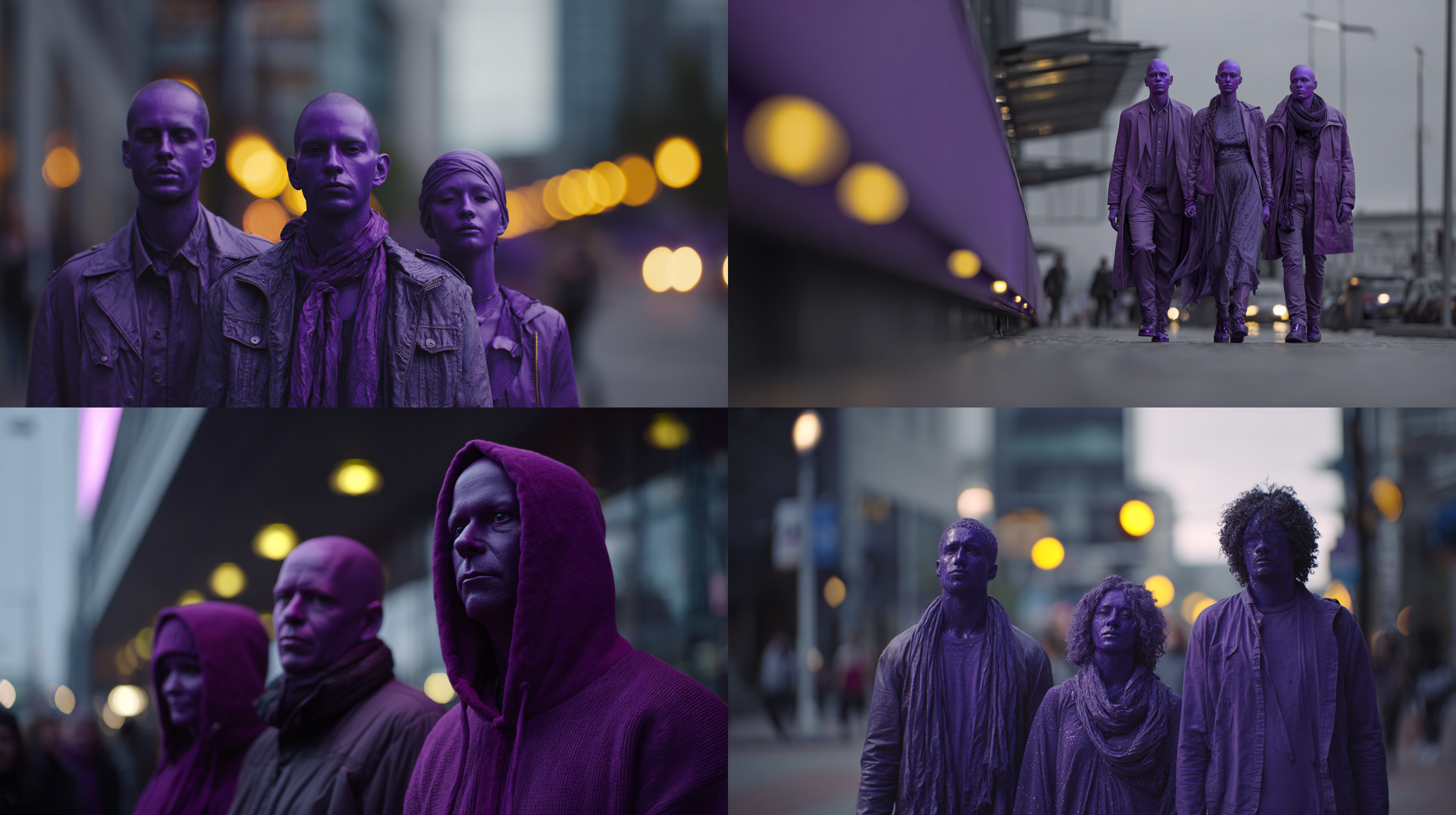 이건 보라색 피부의 사람들이 보랏빛 도시를 걷는 모습을 생성하고 싶어서 여러 시도를 한 과정이다.