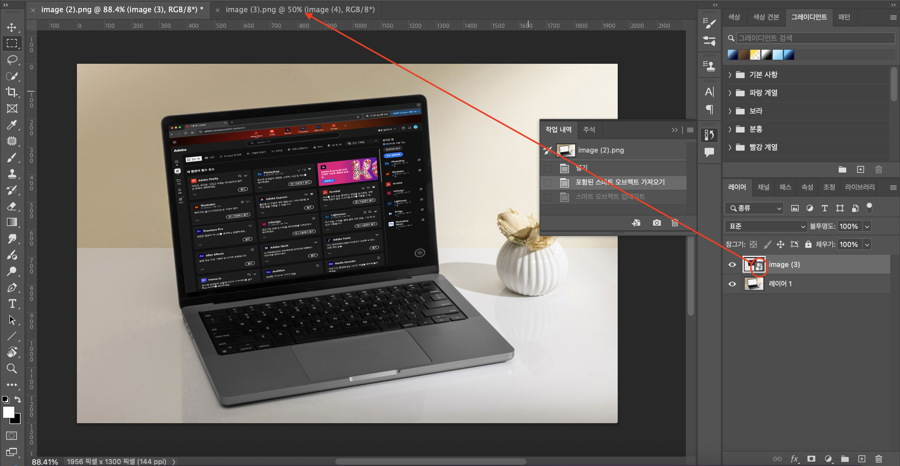 레이어 이미지 우하단 스마트 오브젝트 더블클릭 > 새 창에서 해당 이미지가 뜸.