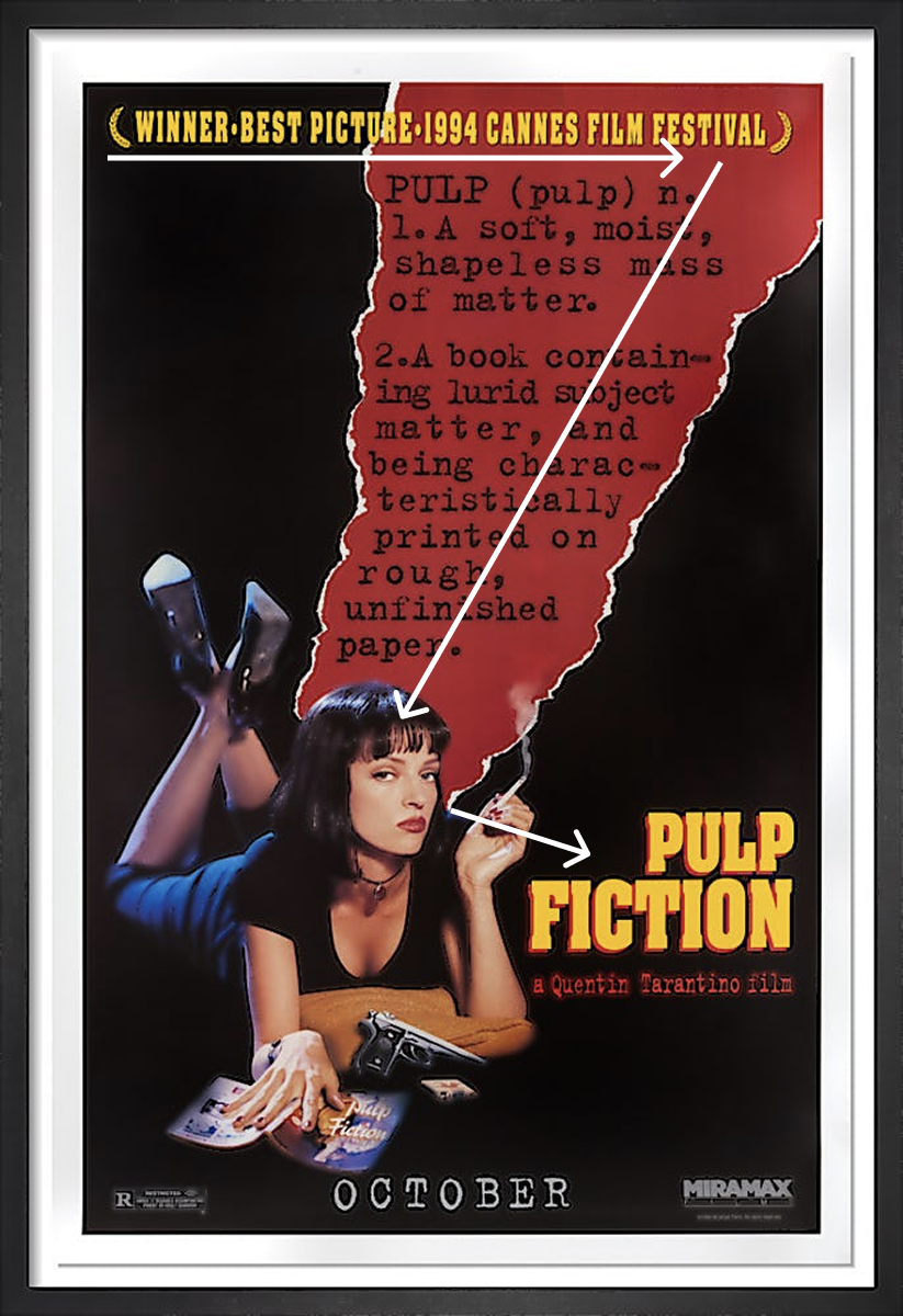 2. 펄프 픽션 - 시선의 흐름 Z자 하향 구조 상단 옐로우 텍스트>찢어진 붉은 종이>엎드린 인물>타이틀 - 시선 이동이 자연스럽게 느껴진 이유 Z자 하향 구조가 뚜렷하게 나타난다. 블랙 배경에 옐로우 폰트는 대비가 확실해 시선을 명확히 집중시키고 우상단에서 좌하단을 가로지르는 찢어진 종이 질감 표현은 밑의 레드 종이를 드러나게 하여 강렬함을 보여준다. 인물이 엎드려있는 방향과 고개, 담배는 시선을 자연스럽게 우측에 있는 타이틀로 이끈다. - 정보의 우선순위 표현 방식 이 포스터에서 가장 영향력이 큰건 컬러같다. 옐로우 블랙 조합은 경고 표시에도 사용할만큼 대비가 강해 시선을 사로잡기에 용이하다. 그리고 가운데의 레드는 찢어진 효과로 더욱 시선에 자극을 준다. 안에는 글자가 적혀있기에 자연스럽게 훑으며 밑으로 내려올 수 있다. 옐로우 컬러의 타이틀은 밑에 레드 오프셋을 깔아 입체감을 더해주는 효과를 줘 다른 글자들보다 시선이 가도록 했다. 타이틀 밑의 감독 이름은 타이틀을 강조하며 밑을 바쳐주는 효과가 있다. 시선을 주는 포인트 외에 배경은 블랙 단색으로 깔아버려, 보여주고 싶은 곳에만 시선을 이끌겠다는 디자이너의 의도가 드러난다. |