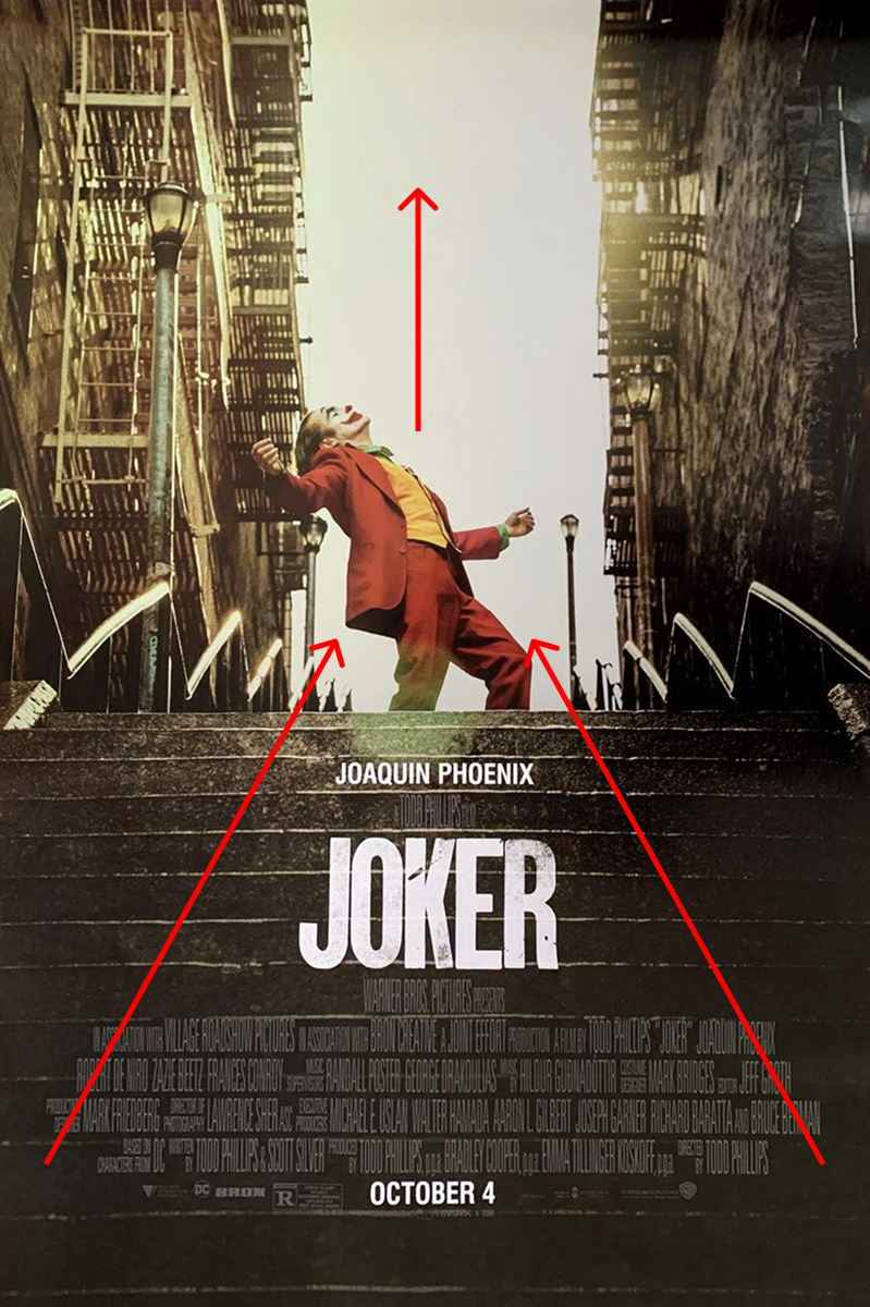1. 조커 - 시선의 흐름 상향 구조 하단 타이틀(고대비)>계단>중앙 인물>상단 여백 - 시선 이동이 자연스럽게 느껴진 이유 1점 투시로 계단을 밑에서 올려다보는 시선이고, 타이틀을 거쳐 춤추고 있는 주인공이 위를 바라보고 있어 자연스럽게 하에서 상으로 올라가게 된다. - 정보의 우선순위 표현 방식 배경을 저채도의 세피아 톤으로 누르고 인물에게 화려한 고채도 컬러의 의상(레드와 옐로우)을 입혀 최종적인 시선이 주인공에게 머물도록 했다. 인물 외에 불필요 요소들을 최소화해 중심부 인물에게 시선이 집중되도록 했다. 양 옆의 빌딩 사이로 좁게 보이는 하늘은 답답하게도 느껴지지만 마치 중심 인물에게 스포트라이트를 비추는 듯한 느낌을 주어 마지막 시선을 머무르게 한다. 상단에는 텍스트가 없어 배경에 여백이 만들어진다. |