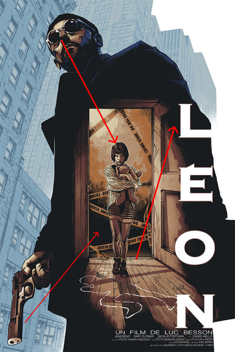 3. 레옹 - 시선의 흐름 프레임형 구조 레옹 얼굴>마틸다>사건현장>타이틀>크레딧 박스 - 시선 이동이 자연스럽게 느껴진 이유 액자형 구조여서 시선이 가장자리부터 중심으로 집중되는 효과가 있다. 투시가 들어간 빌딩들, 레옹이 서있는 기울기, 바라보는 방향, 손에 든 총이 레옹의 몸에 그려진 문으로 시선을 유도한다. 문의 프레임은 그 안에 서있는 마틸다에게로 자연스럽게 고정되고 발끝에 그려진 사건 현장까지 이어진다. 마지막으로 가장 우측에 세로로 적힌 타이틀을 상하로 읽게 되고 하단부의 크레딧 박스에 시선이 닿는다. - 정보의 우선순위 표현 방식 크기대비가 명확하다. 레옹의 실루엣(최대)>문과 마틸다(중), 세로 타이틀>하단 크레딧박스 배경의 건물은 옅은 블루, 큰 인물은 블랙에 가깝게, 문의 안쪽은 따뜻한 오렌지빛으로 표현해 대비를 줘 밝은 중심을 부각시킨다. 총·팔·문틀·바닥 원근선이 모두, 문과 마틸다로 수렴해 2차 시선을 고정시킨다. 또한 바깥에서 안으로 들어갈수록 점점 묘사가 디테일해져 집중도를 높인다. |
