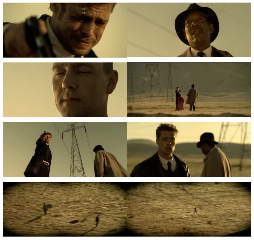 - 초반에는 젊은 형사와 범인, 선배 형사와 박스, 헬리콥터 세 시점이 번갈아 컷으로 제시되며, 같은 시간의 상황을 다른 관점에서 보여준다.