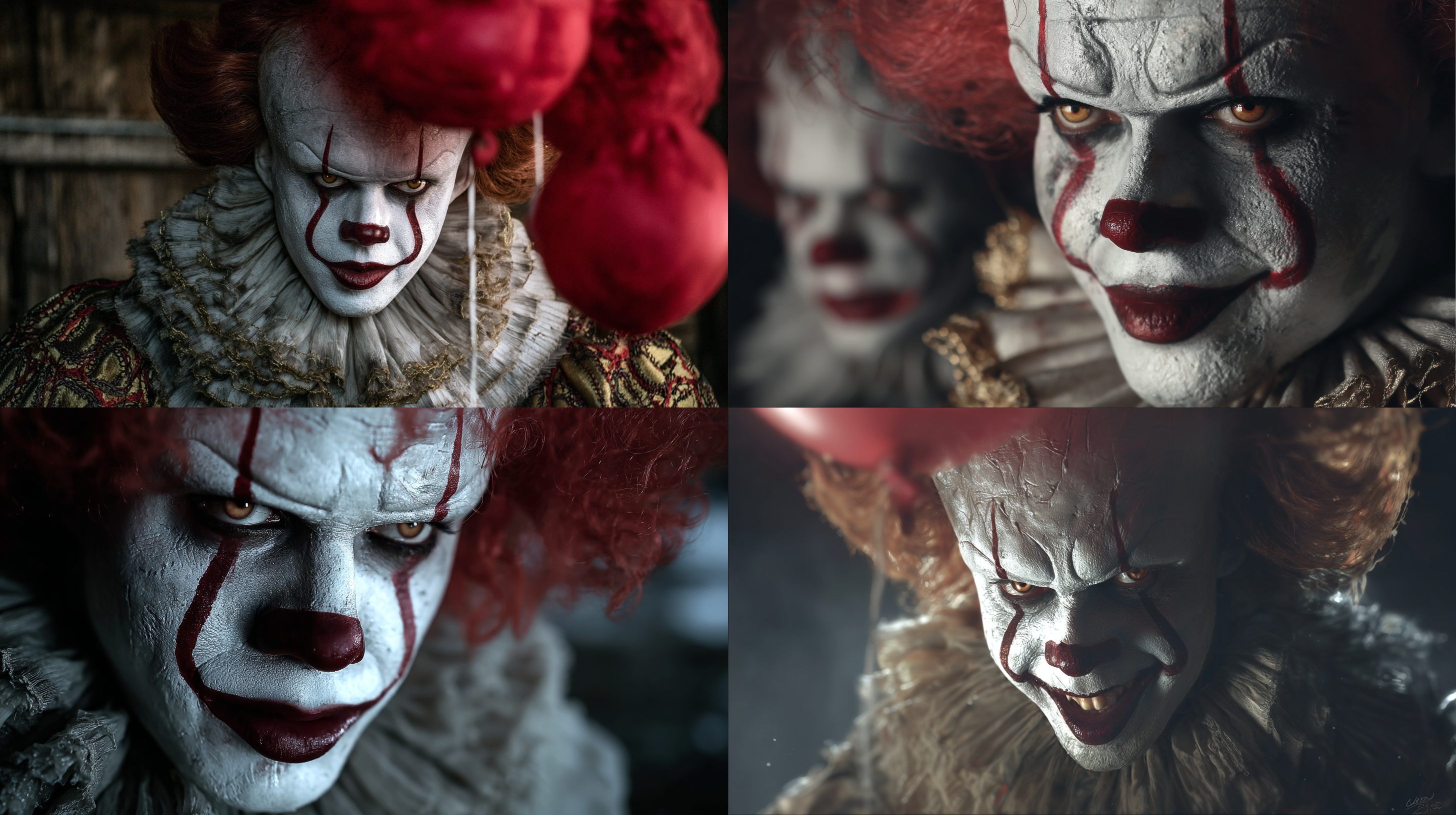 그런 이유로 미드저니로 pennywise the dancing clown을 입력해 이미지를 생성했는데 고증은 상당히 잘 됐지만 많이 심심했다.