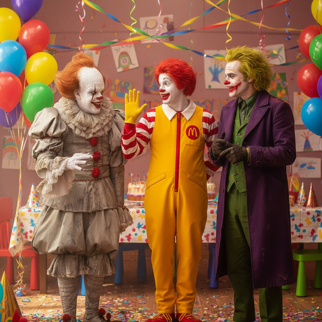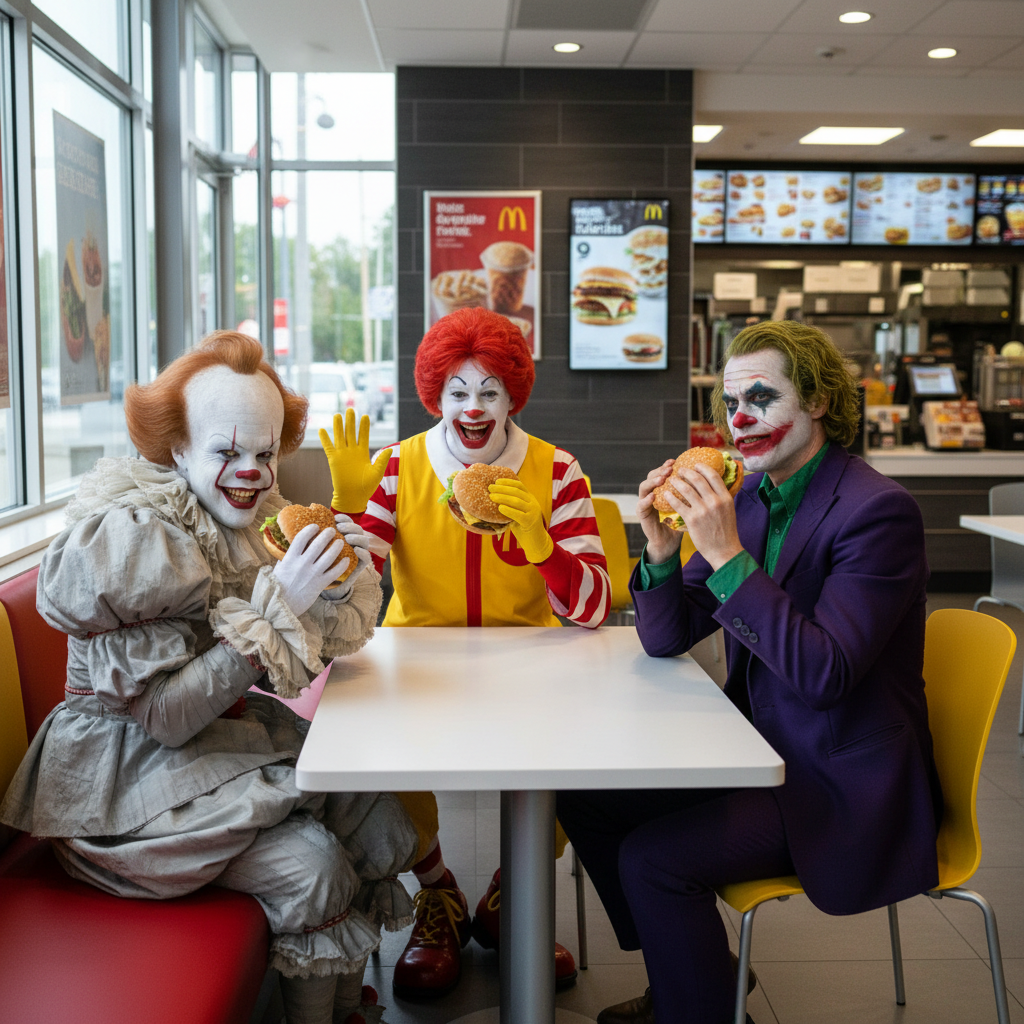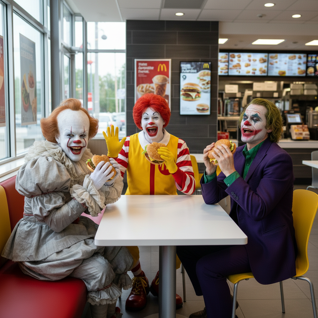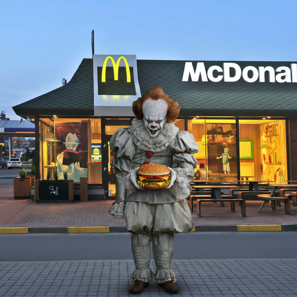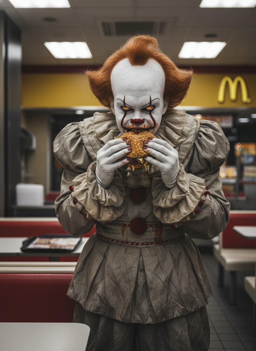 세 이미지를 합쳐서 맥도날드에서 빅맥 먹는 페니와이즈를 만들어보고 싶었는데, 팔도 이상하고 비율도 엉망이다.