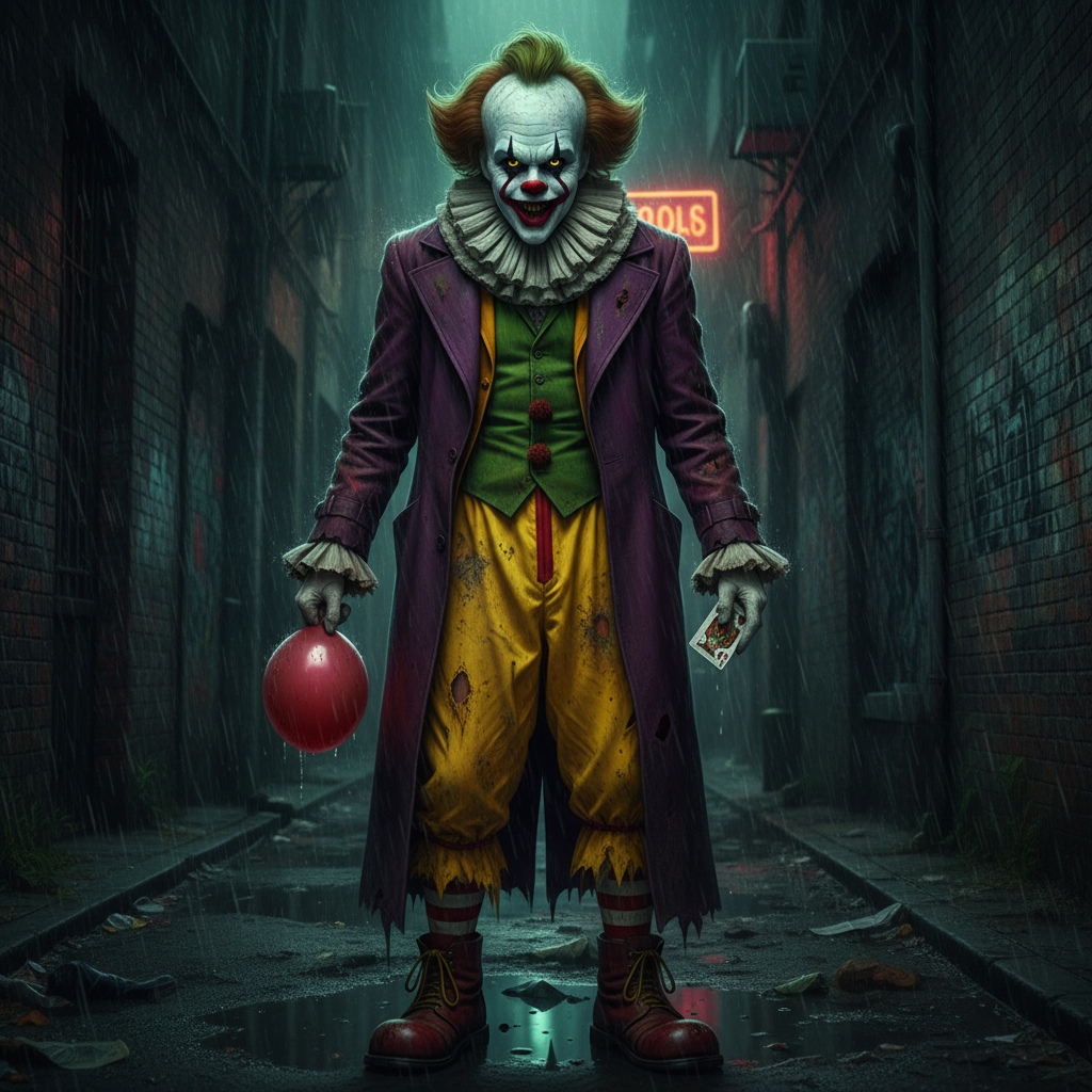 Batman confronting Pennywise the clown in a dark rain-soaked urban street,