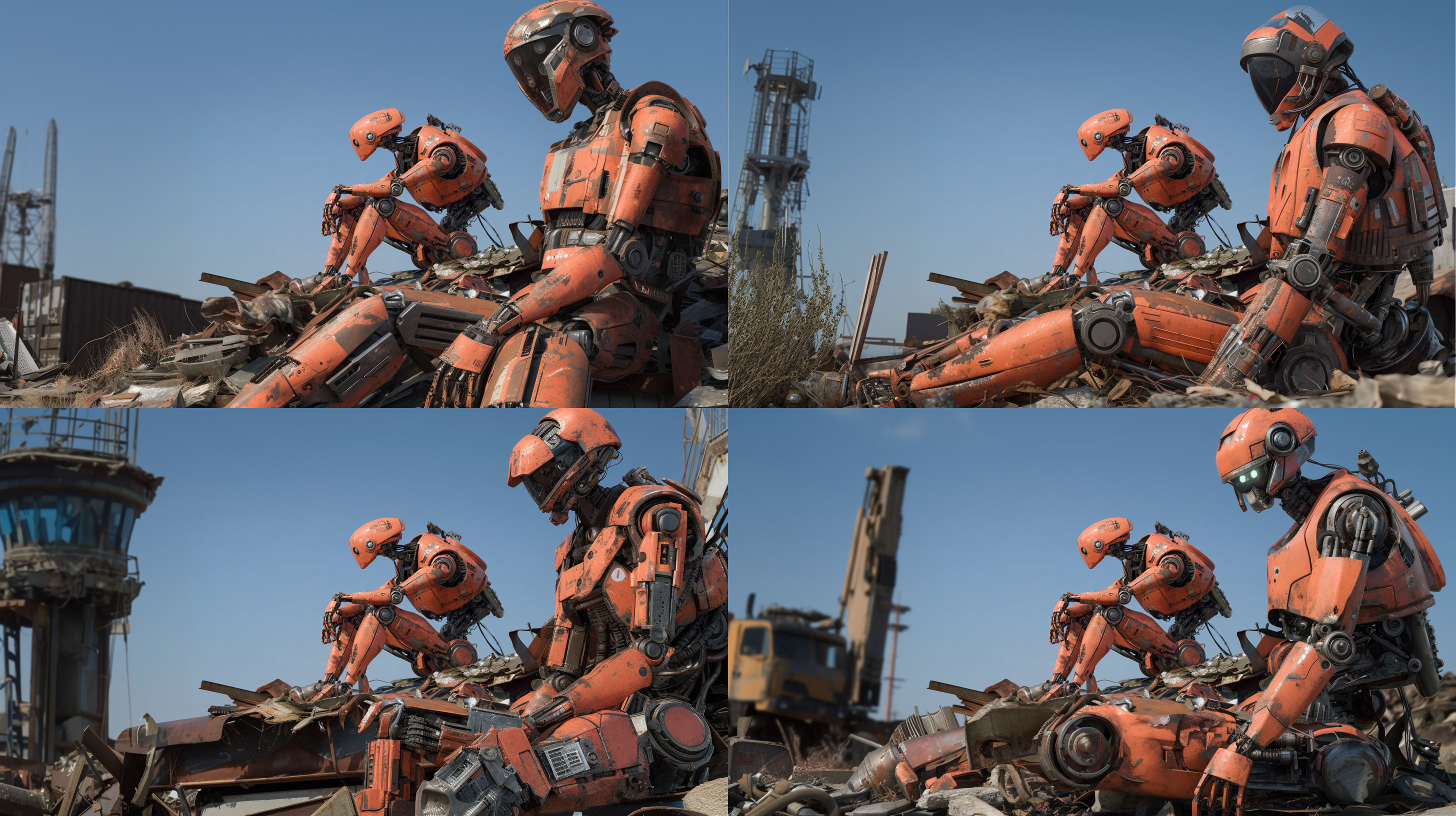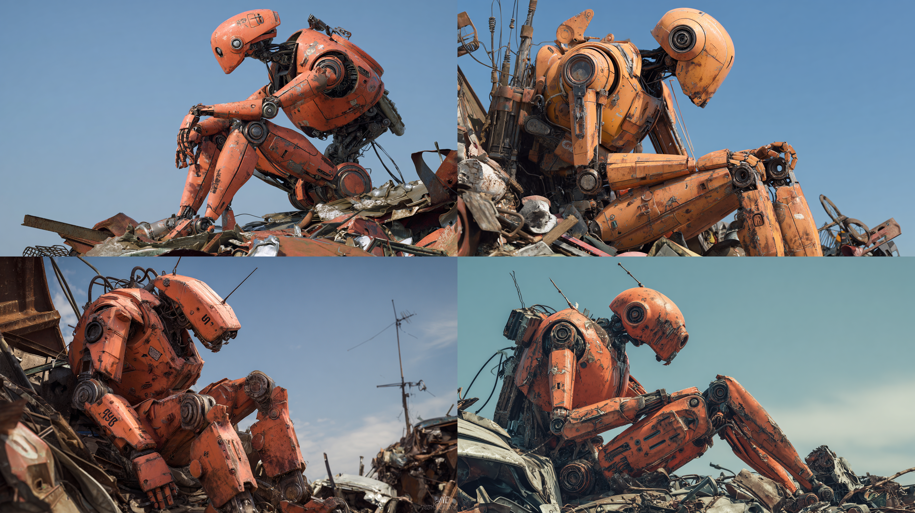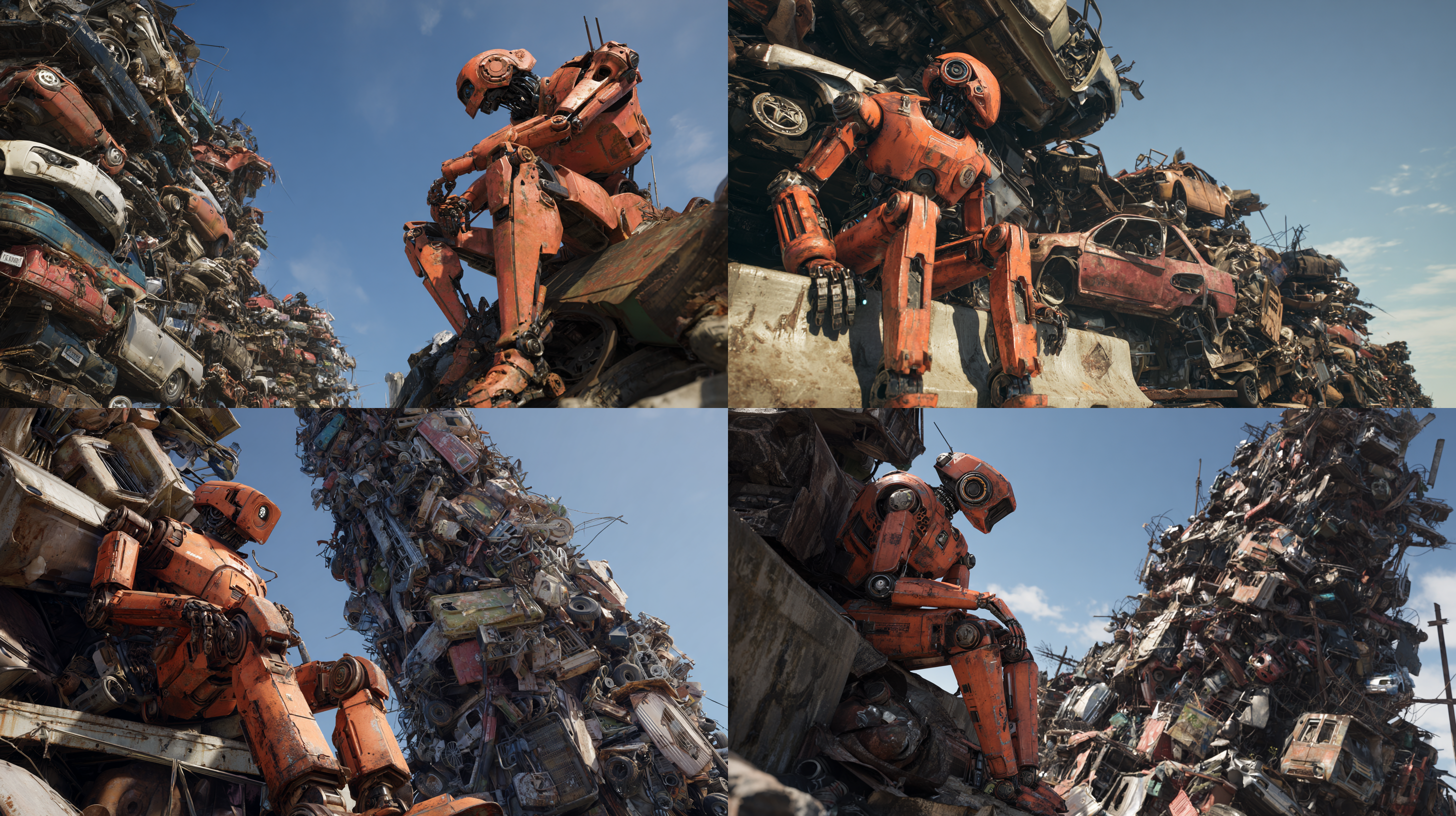 높게 쌓여 있는 쓰레기더미 위에 앉아 있는 주황색 로봇을 만들고 싶어 프롬프트를 지피티로 구상해 생성했다.
