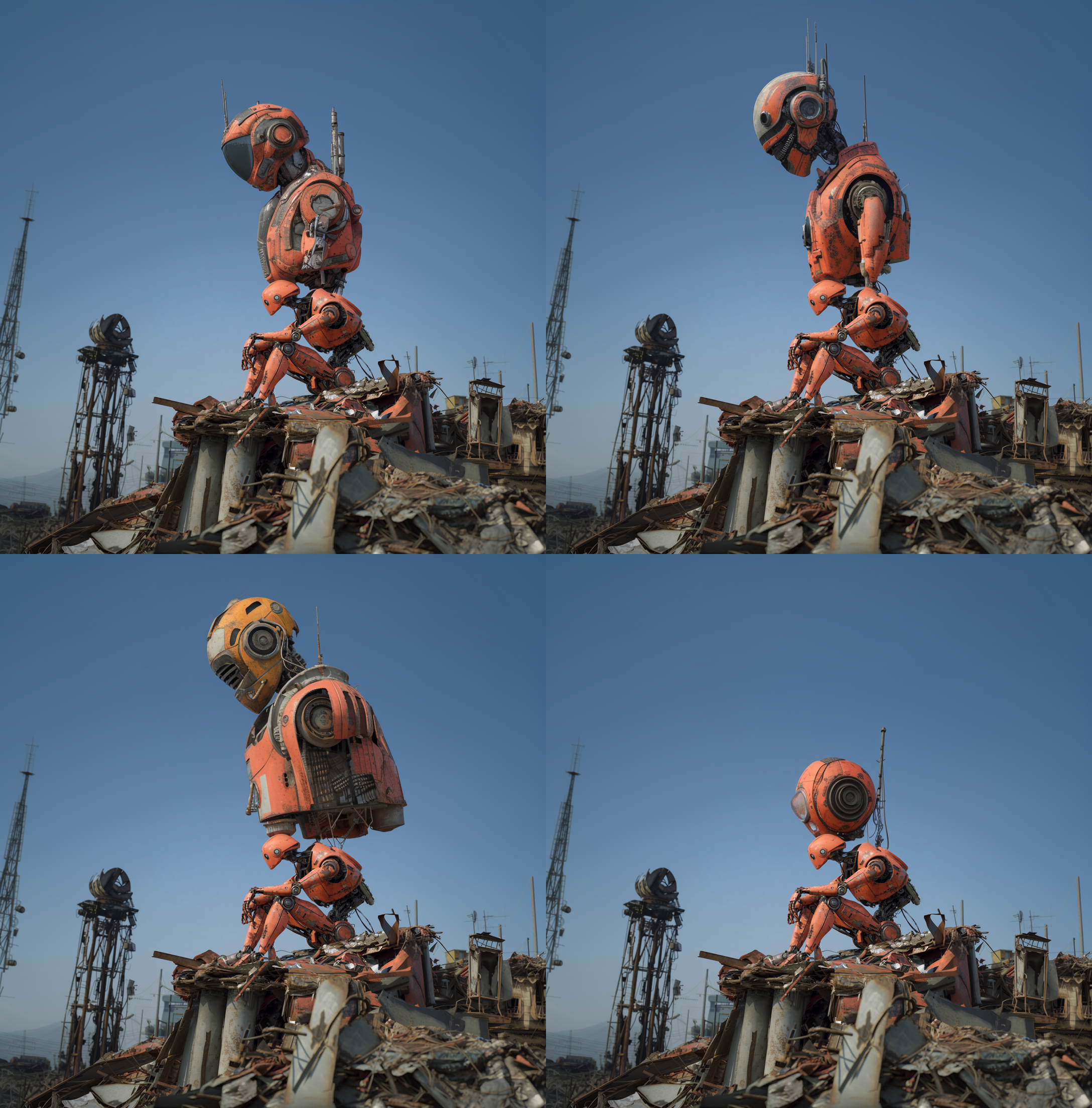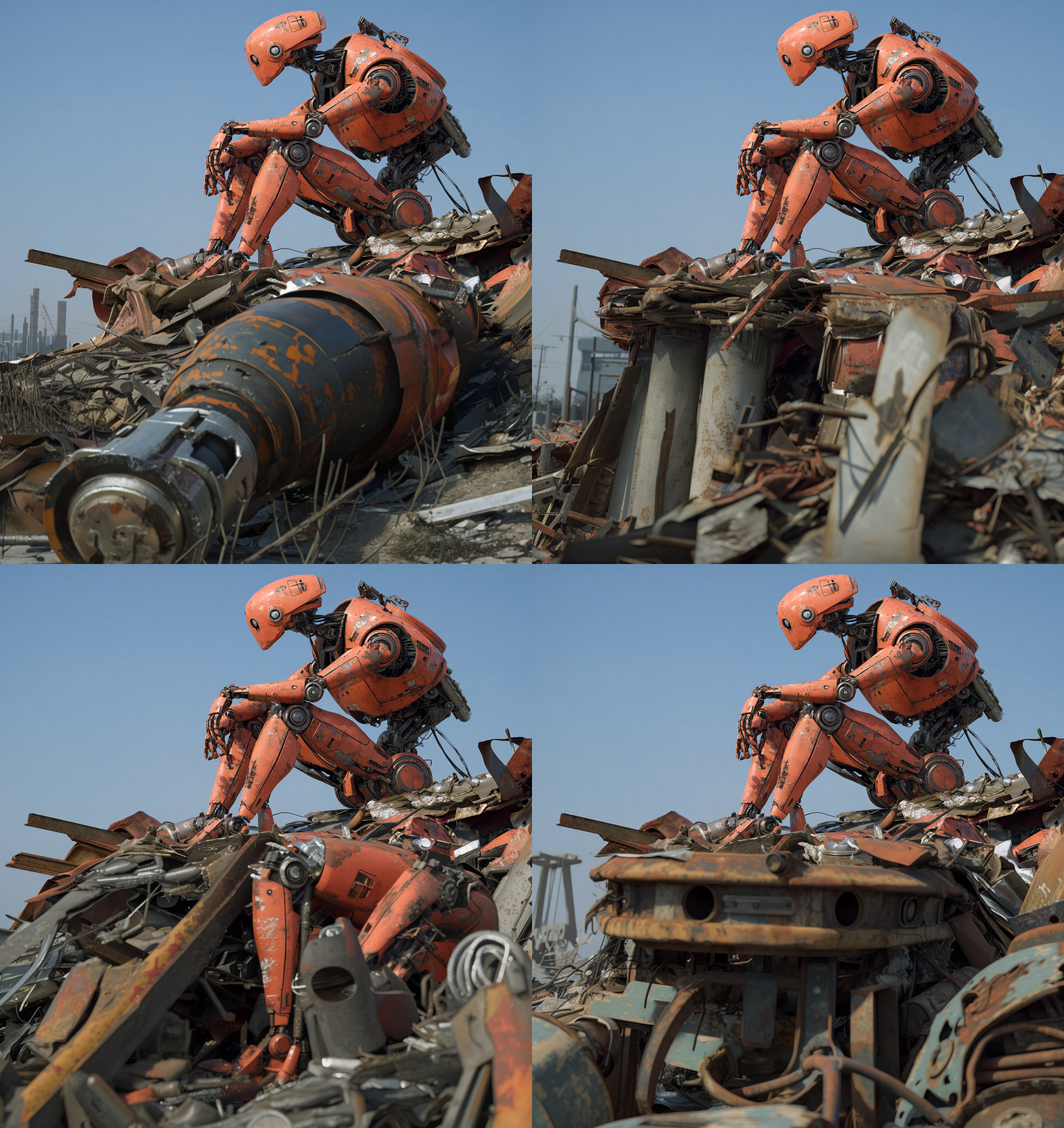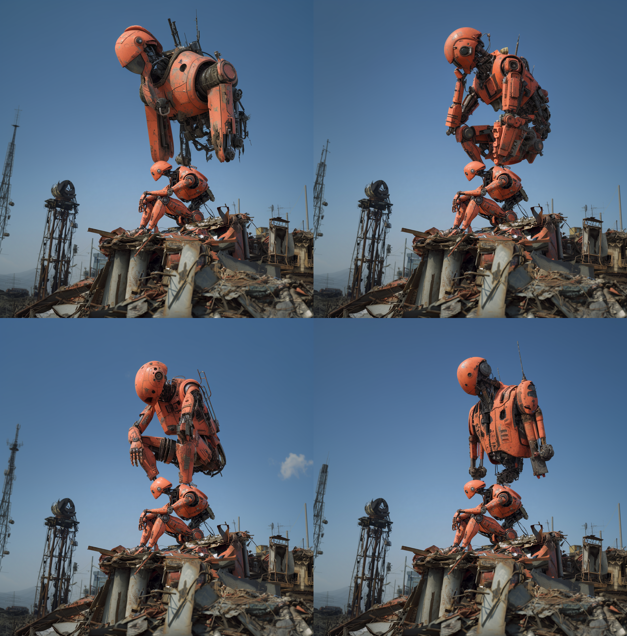 높게 쌓여 있는 쓰레기더미 위에 앉아 있는 주황색 로봇을 만들고 싶어 프롬프트를 지피티로 구상해 생성했다.