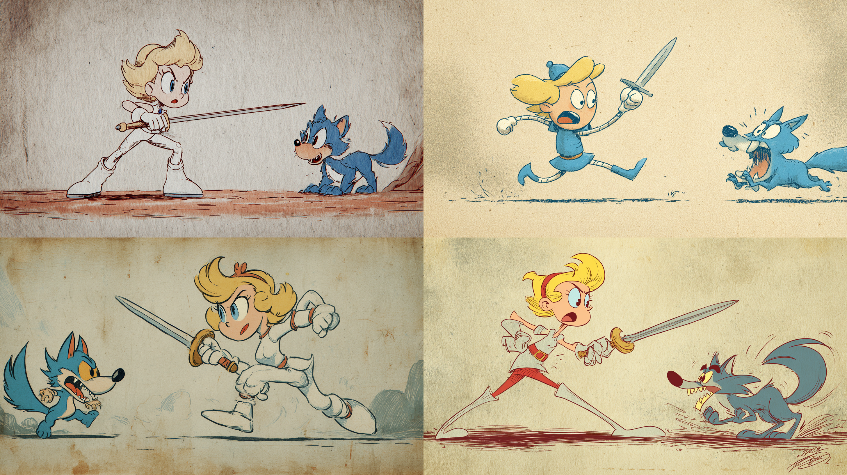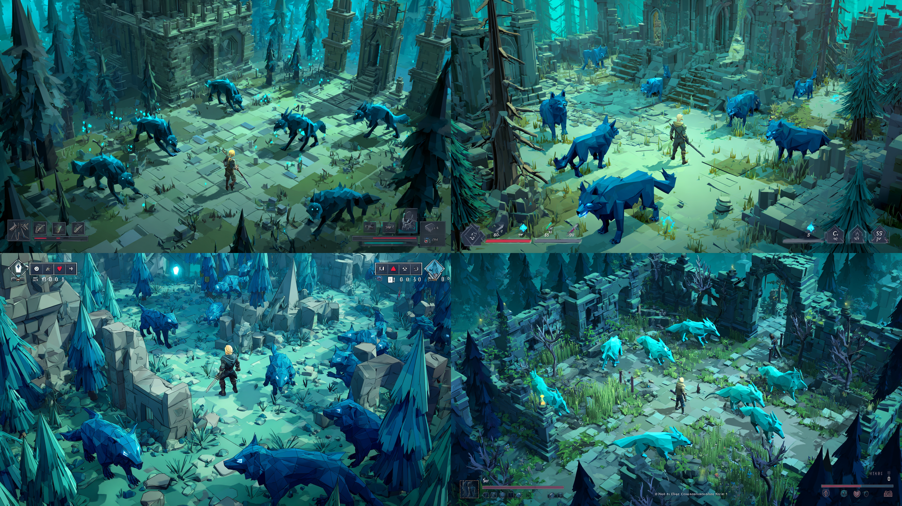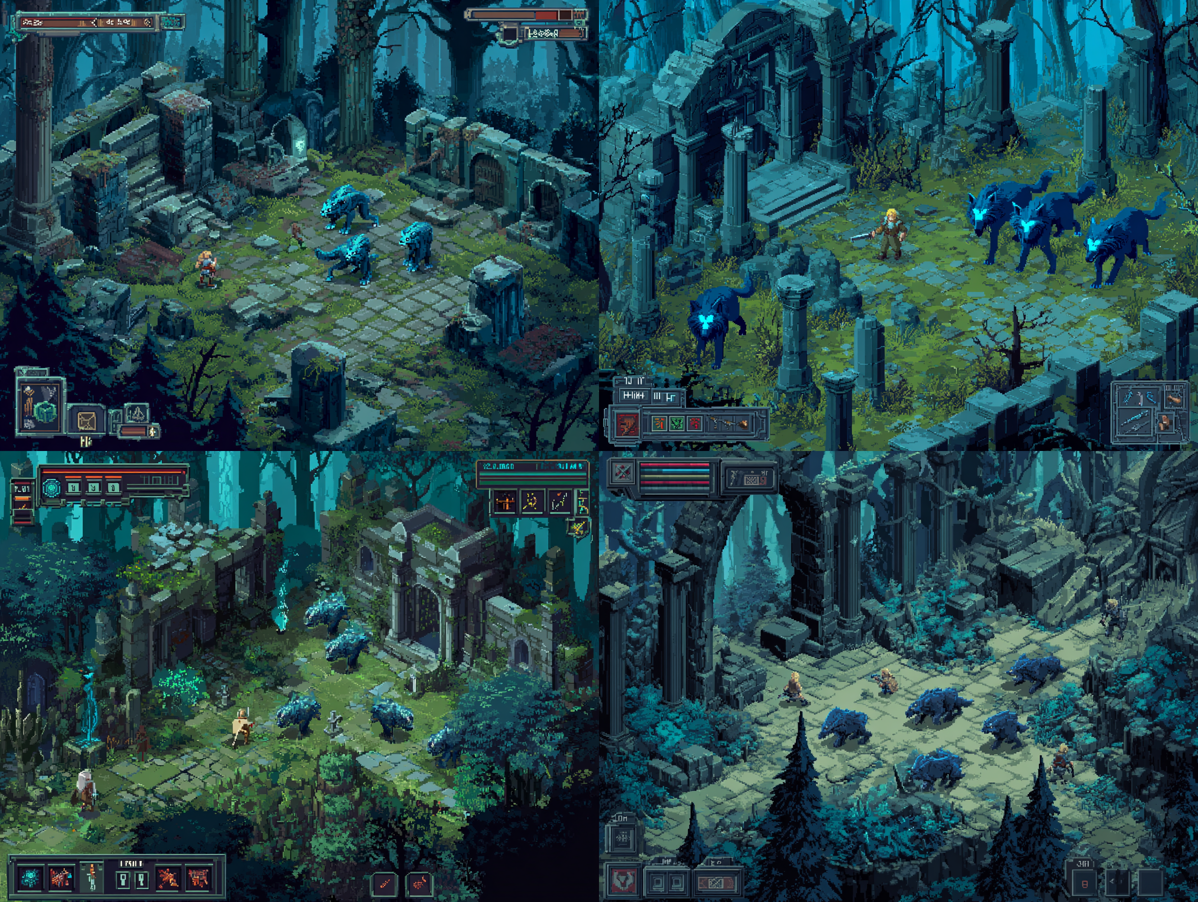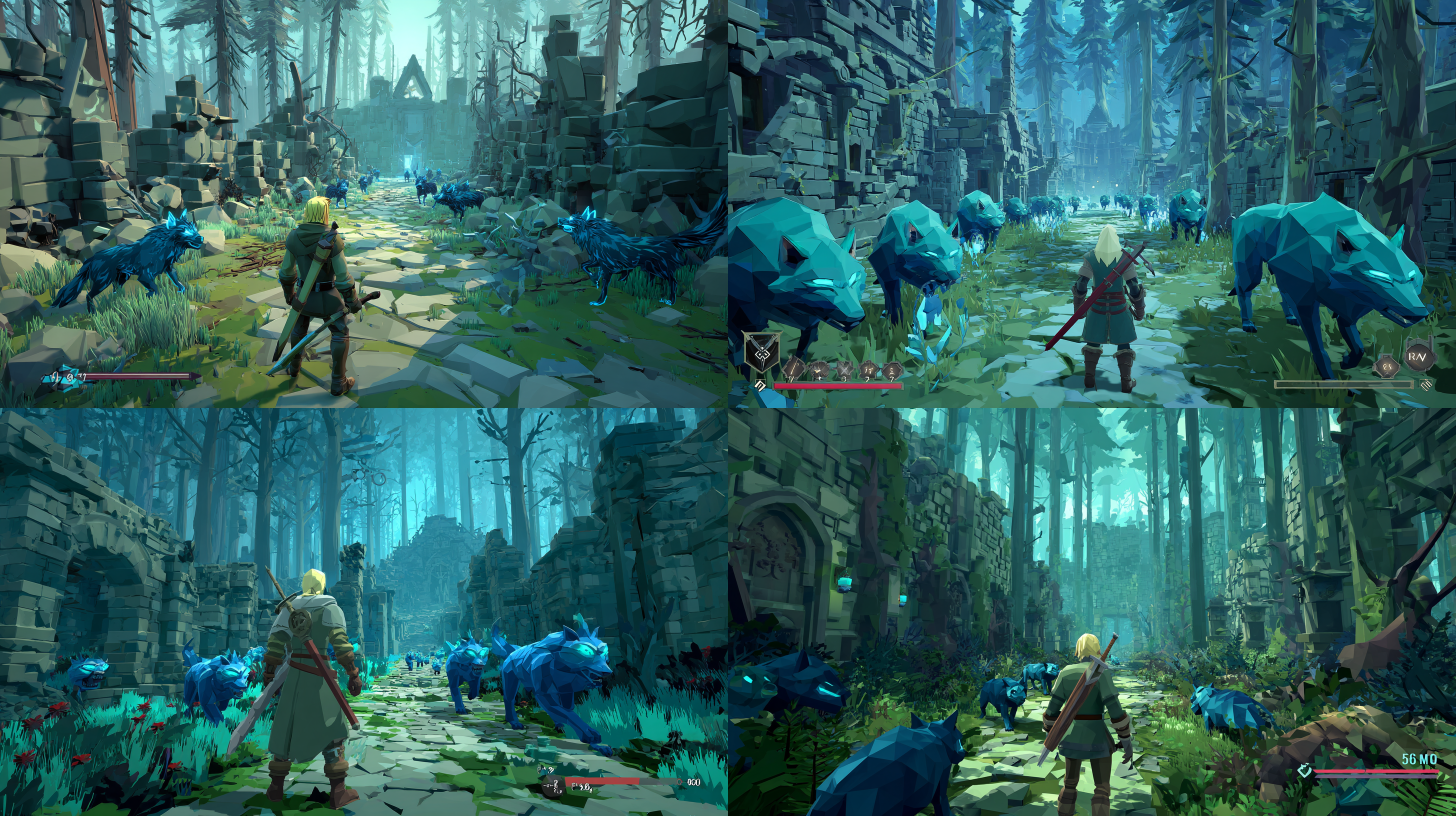 그래서 금발의 칼을 든 플레이어 캐릭터와 푸른 빛 늑대 몬스터들을 프롬프트에 명시해서 다시 생성했다.