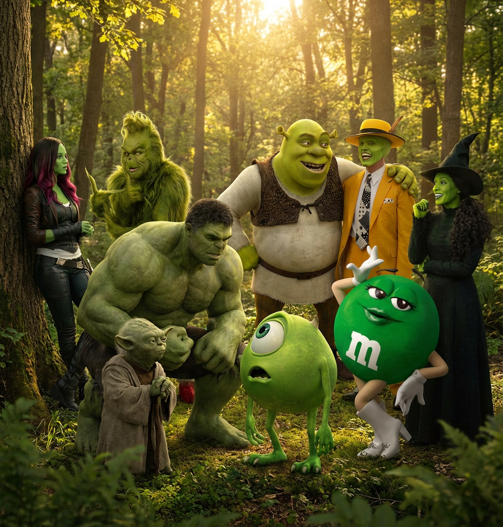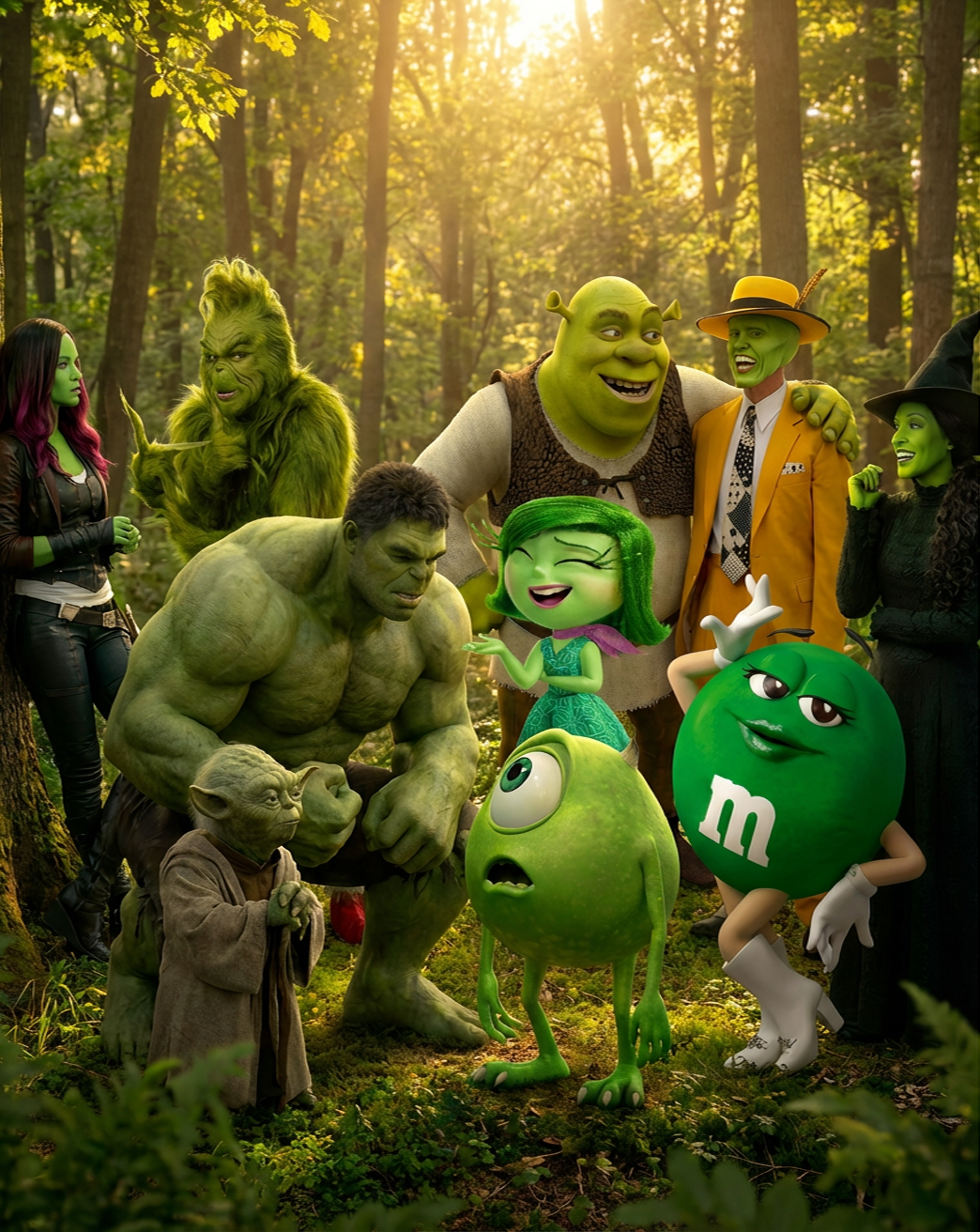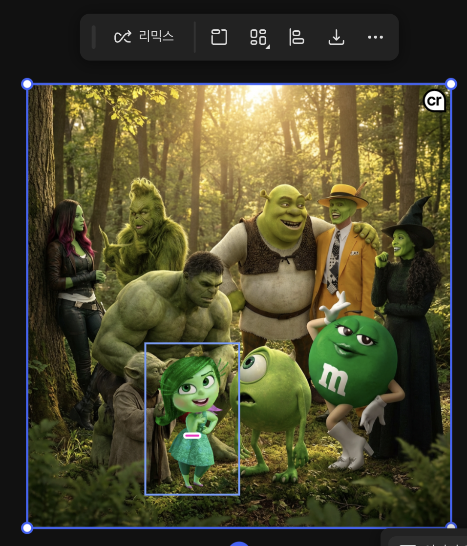 나머지 캐릭터들을 선택한 후에 이 모든 인물들이 자연에서 자연스럽게 상호작용을 하는 이미지를 생성해달라고 하자 이런 이미지가 생성됐다.