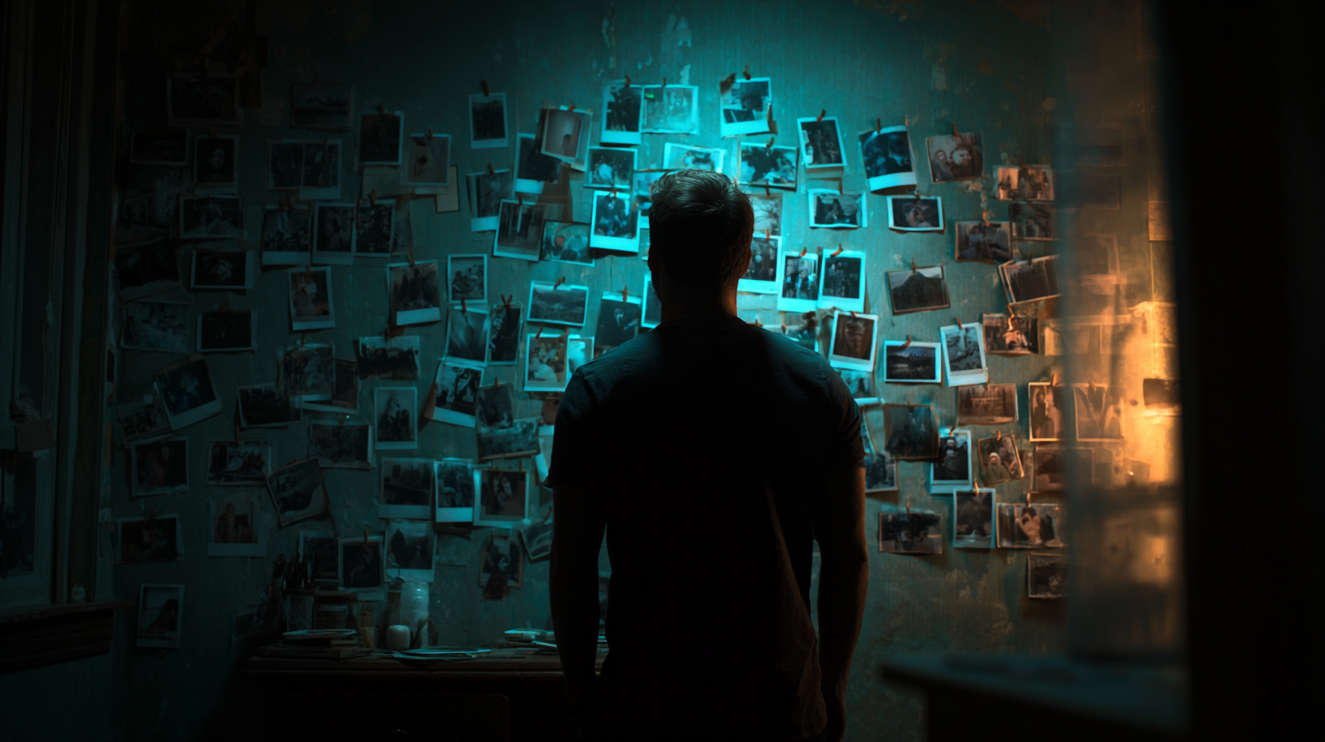 cinematic thriller movie still, teal and cyan color grading, dark small room interior at night, man standing in front of a wall covered with polaroid photos pinned with thumbtacks, one polaroid photo held in his hand, back view, face not visible, moody lighting, strong shadows, minimal composition, psychological tension, realistic film grain, movie trailer frame, no text, no logo, no title --ar 16:9 --v 7.0