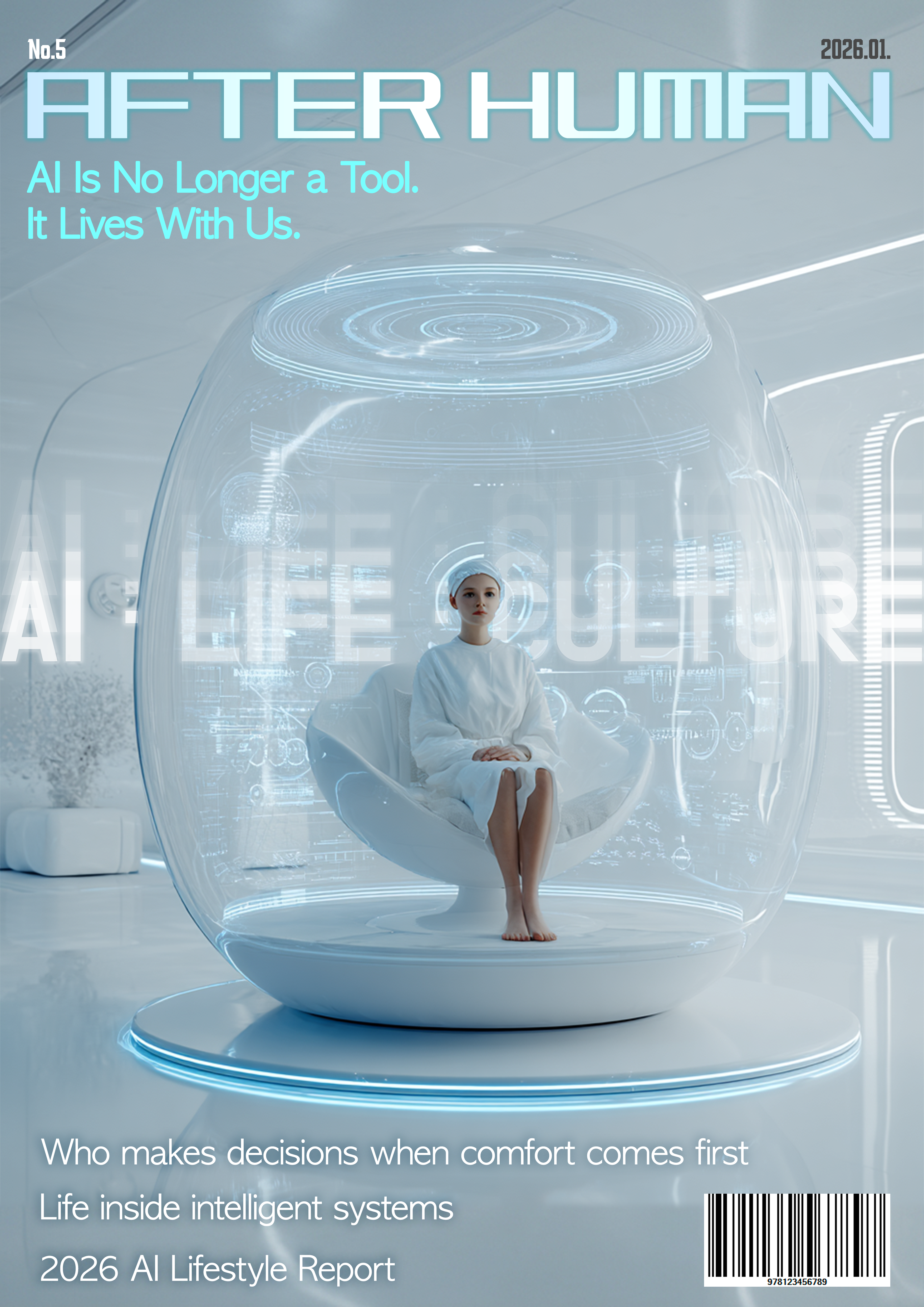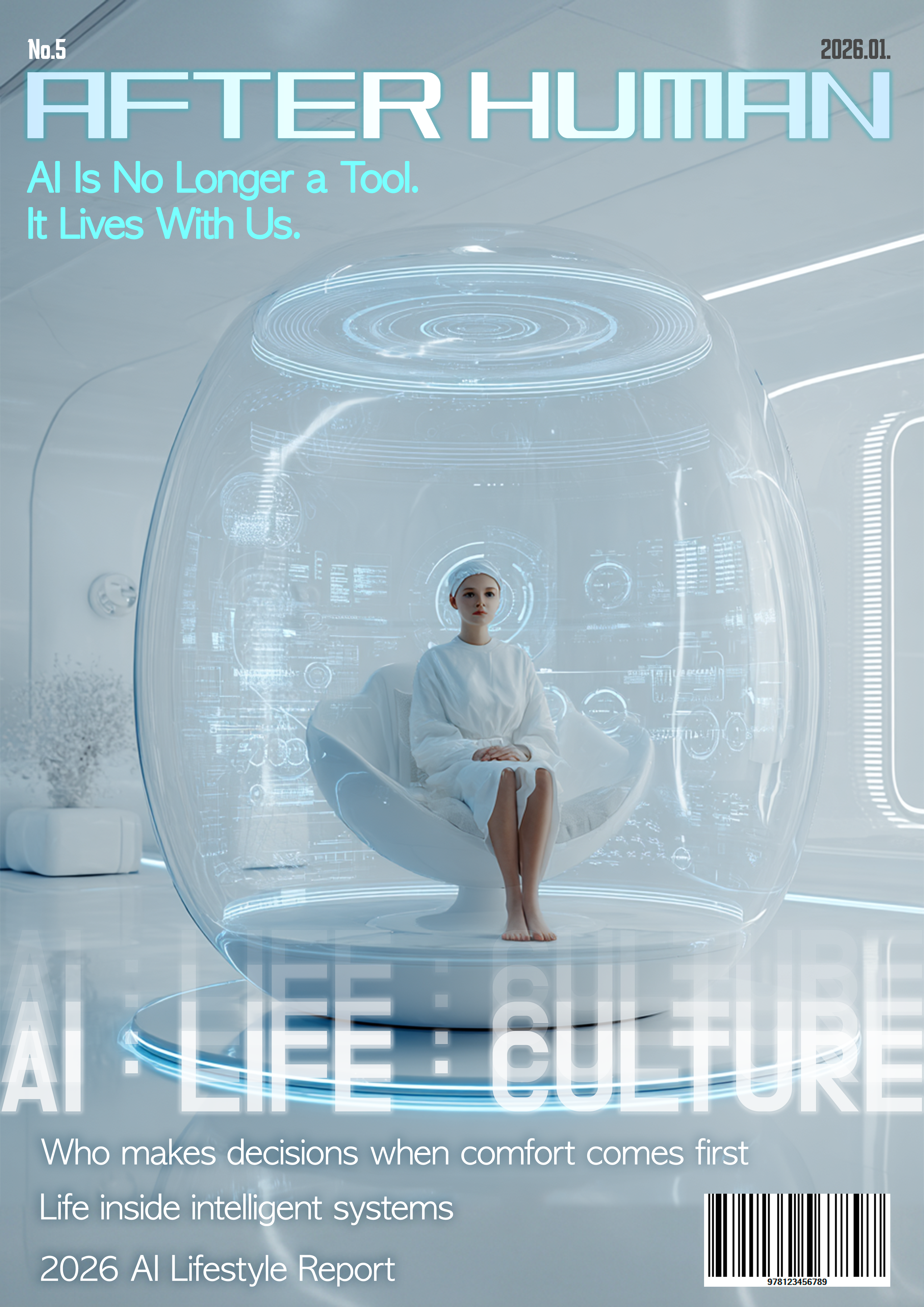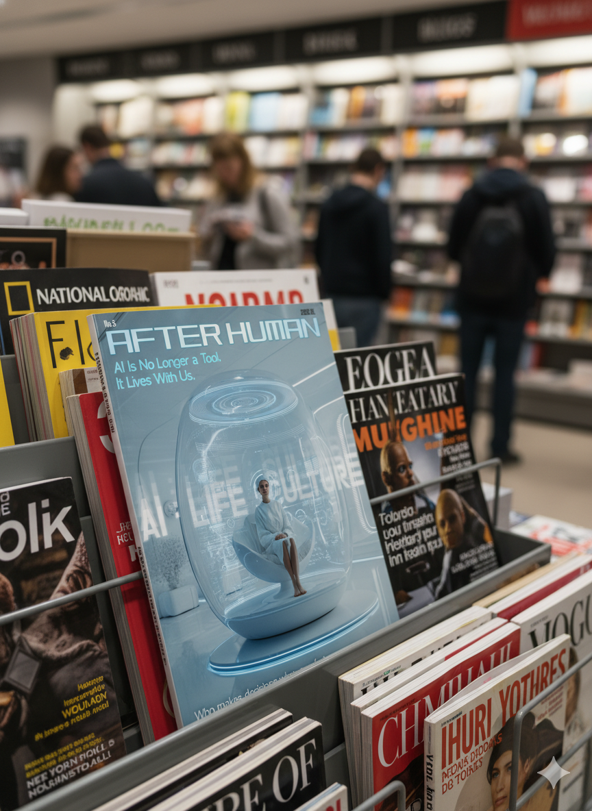 본 프로젝트는 2026년을 배경으로 한 가상의 테크·라이프스타일 매거진 AFTER HUMAN의 커버 디자인을 기획·제작하는 것을 목표로 한다. 기술 발전 자체를 설명하기보다는, AI가 이미 일상의 환경이 된 이후 인간의 위치와 태도를 질문하는 데 초점을 두었다.