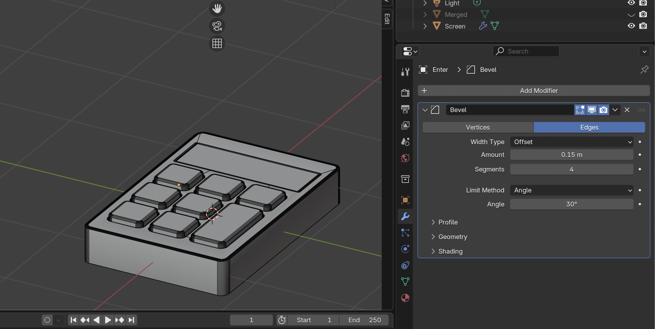 스크린 부분은 살짝 네모가 보이긴 하지마 입체감이 없어서, apply로 변환된 상태를 저장한 뒤 extrude를 이용해 파이게 만들었다.