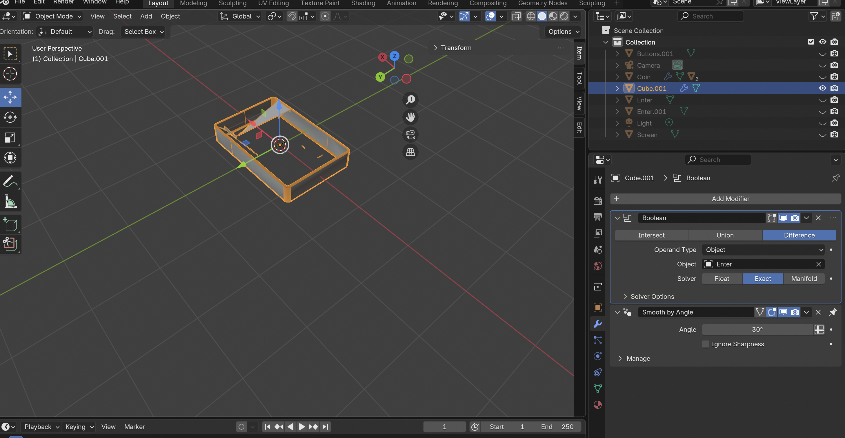 계산기 버튼들과 스크린, 그리고 본체를 다 선택한 후에 cmd+J로 하나로 만들고, 복붙해둔 원본 오브젝트 중에서 본체를 선택했다.